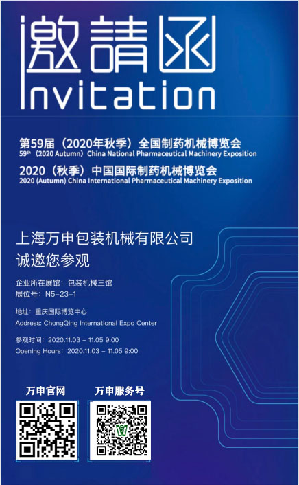 第59届(2020年秋季)全国制药机械暨中国国际制药机械博览会将于2020年11月03日至11月05日在重庆国际博览中心举行。该博览会曾连续被中华人民共和国商务部列为重点支持展会之一, 是业界公认的专业化、国际化、规模大、展品全、观众多,集贸易、研讨于一体的制药装备行业交流平台。
