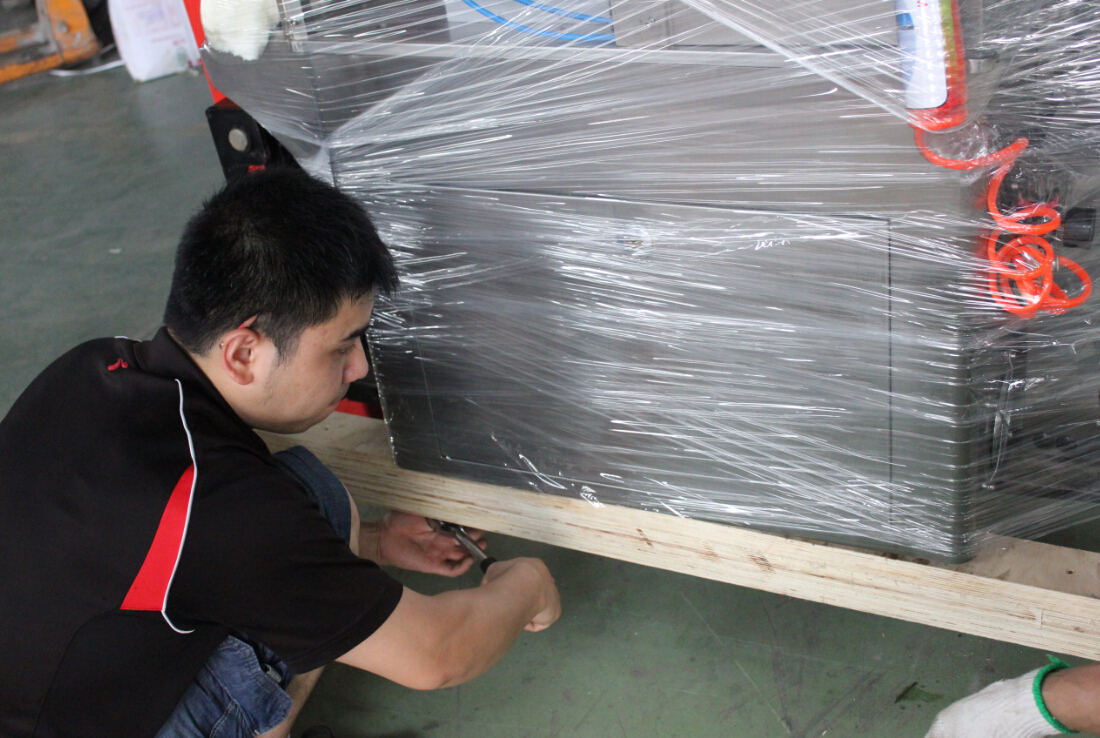因为要漂洋过海,所以我们会在机器全身都涂满保护油,并且为装盒机包上缠绕膜,进料减少与空气接触。