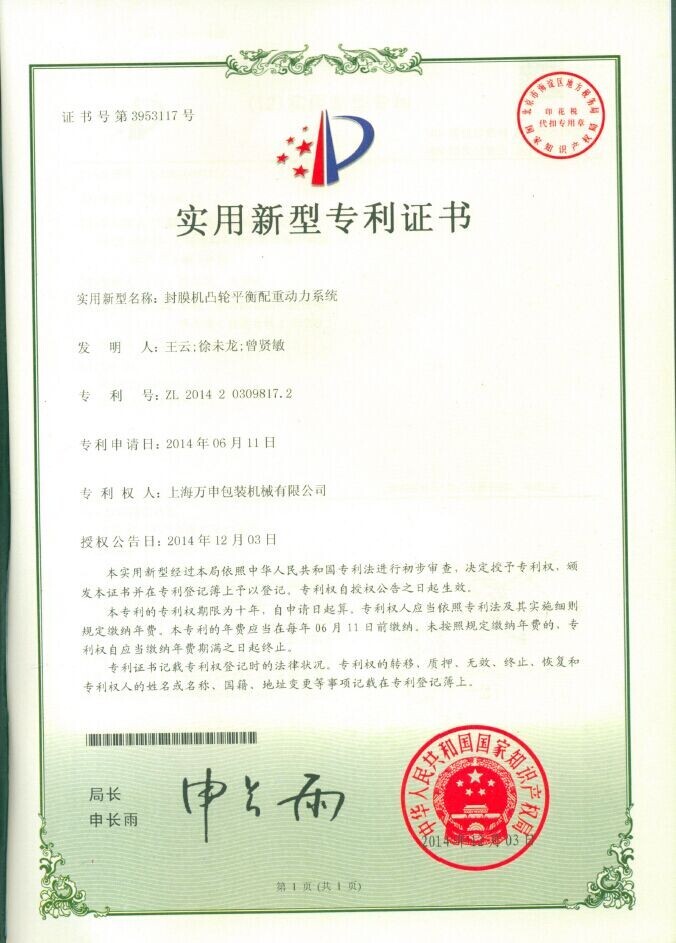 为了让产品可以更好的营销,为了让我们的产品可以在同行中取得胜任,让客户更加支持万申,,我们的相关部门工作人员特此申请一系列的新型实用证书,而且现已成功通过并实用,此次申请下来的项目有:铅笔自动排整梳理系统、封膜机凸轮平衡配重动力系统、单机智能自动铅笔装盒机。
